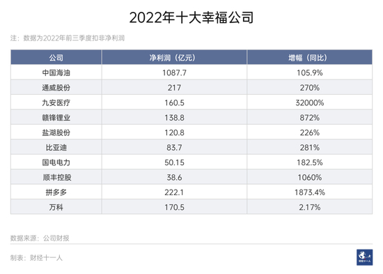 2022年十大幸福公司,本文的选择标准是当年利润。