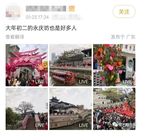春节假期前三天从除夕到年初二,广州地铁每日客流均为内地城市第一,外出走亲访友、揾食行街的人流可见一斑。据网友反映永庆坊、上下九、北京路、广州塔、动物园、各大公园等地人气爆棚、热闹非凡。