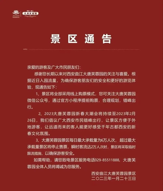 为确保游客的安全和良好的游览体验,1月23日起,西安城墙景区、大唐不夜城、大唐芙蓉园等多个景点采取临时限流措施或演出时间调整措施。各景区还倡导本地市民尽量选择错峰出行,让远道而来的客人有机会更好感受西安的魅力。