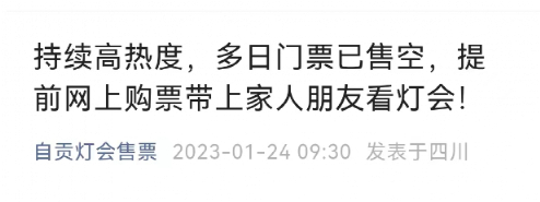 第29届自贡国际恐龙灯会也宣布,园方将采取限流措施,请游客及时调整出行计划,建议晚场入园观灯22:30-00:00,闭园时间为00:30。