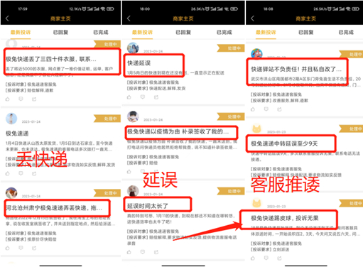 第一,送丢寄件人快件。多位消费者称极兔快递寄丢了自己的快递,但网点在索要了一堆价值证明之后却没了下文,一拖再拖推诿赔付;第二,寄件缓慢。有消费者称自己的快递到站20余天后仍没有派发,也有消费者称自己的快递发出半个多月了仍显示在路上;第三,客服服务态度差。消费者投诉无果,敷衍拖时间。