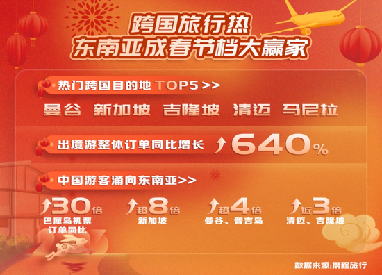 在出境游线路上,东南亚成为大热门。携程数据显示,春节期间,出境游机票订单中,巴厘岛机票订单同比增长30倍,新加坡增长8倍以上,马尼拉增长超5倍,曼谷、普吉岛增长超4倍,清迈、吉隆坡增长近3倍。