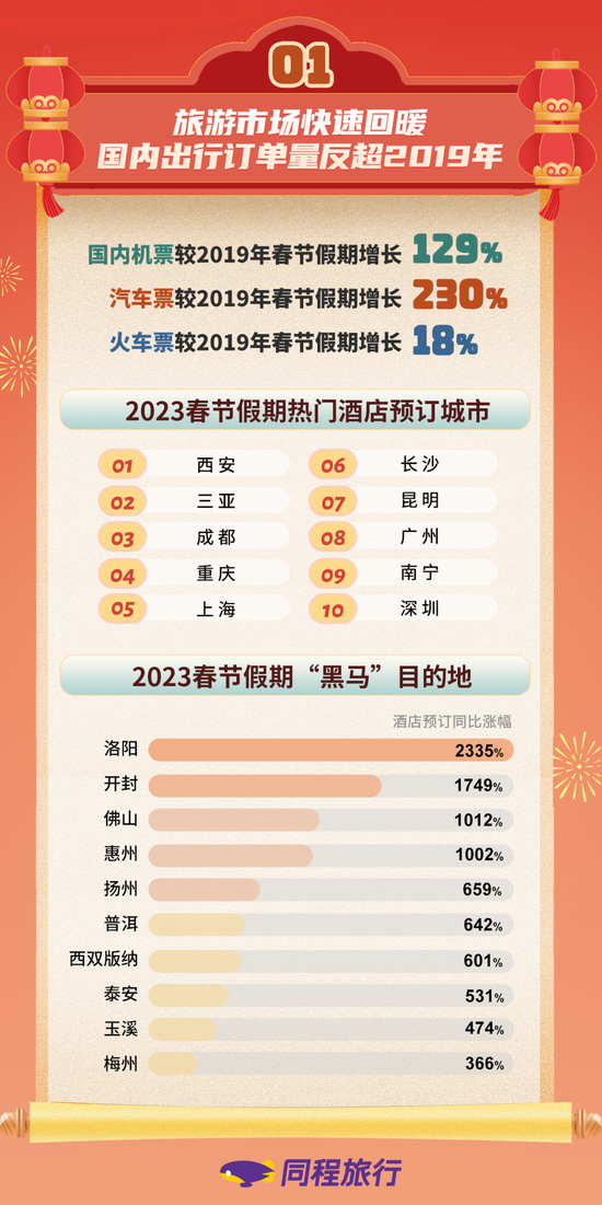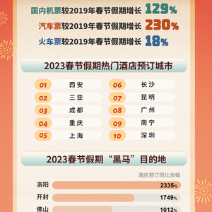 出行数据的增长最为直观,反映人们的出游动力。同程旅行数据显示,今年春节假期,同程旅行平台国内机票预订量较2019年同期增长129%,汽车票预订量较2019年同期增长230%,火车票预订量较2019年同期增长18%。