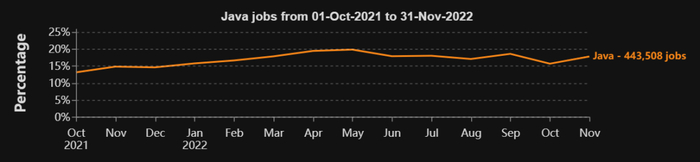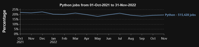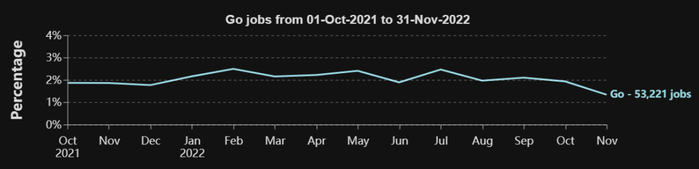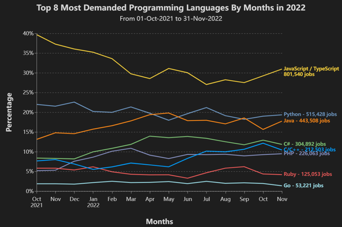 从 2021 年 10 月到 2022 年 11 月(十四个月),DevJobsScanner 共发现了 801K 个工作机会,占具有明确编程语言需求工作中的约 31%。