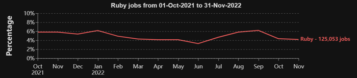 Ruby 排名第七,共找到了 12.5 万个工作岗位(约占总工作需求的 5%)。它最流行的用法是与 Web 框架 Ruby on Rails 结合使用。尽管前七名看起来并不算很高,但 Ruby 在当今的一些大型科技公司,如 Twitter、Crunchbase 或 Github 都有应用。