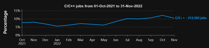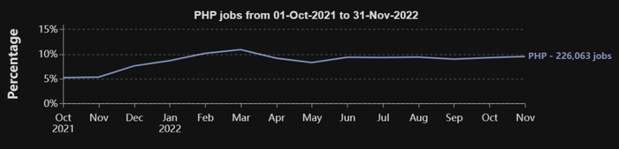 C#、C / C++ 和 PHP 也是值得关注的语言,因为它们有着一致的上升趋势。尤其是,在 2021 年 10 月 PHP 的需求还只占总需求的约 5%,但到 2022 年 11 月占比就已经接近 10%,几乎翻了一番,这是不是有点出乎了你的意料呢~。