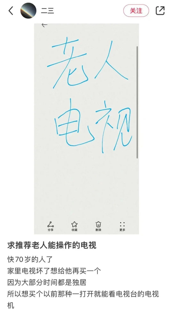 最近,我在小红书上看到一则求助帖,有人问,有没有方便老年人操作的电视机。