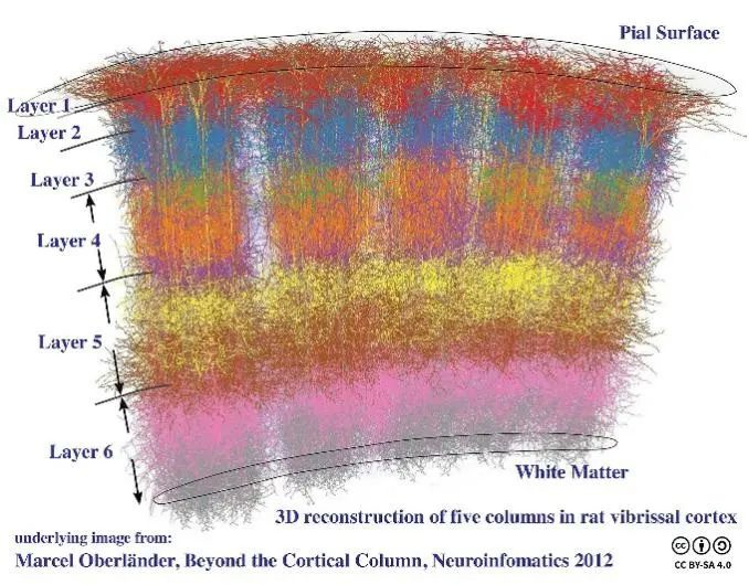 另外,目前皮层柱的研究结果主要来自感觉皮层和运动皮层,因为对这两种皮层,实验可以探测其中神经元的功能作用,才谈得上神经元的感受野或投射野。而对于联合皮层,我们很难知道其中单个神经元的功能作用是什么,也就无从知道联合皮层是否具有功能意义上的皮层柱结构。