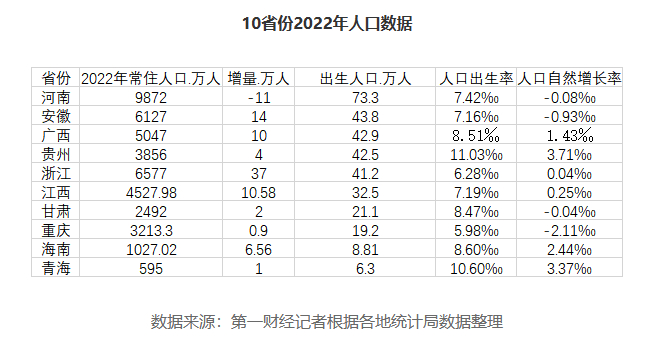 在出生率普遍下滑、死亡率上升的同时,有多个省份人口自然增长率近几十年来首现负增长。相较于上一年,各省份2022年人口出生率悉数下降,人口死亡率普遍略有上升。其中江西、甘肃、广西、海南、贵州出生率降幅均超过1个千分点。