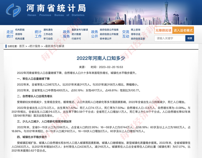 据河南省统计局2月20日消息,2022年河南省常住人口总量继续下降,自然增长人口六十多年来首现负增长。