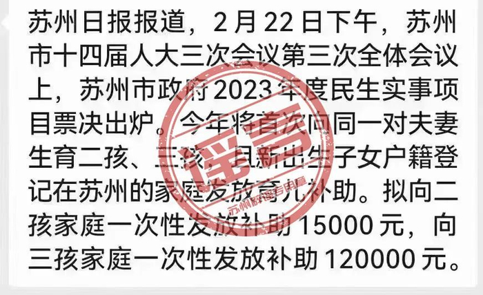 今天(22日),有传言称“苏州拟向二孩家庭一次性发放补助1.5万元,向三孩家庭一次性发放补助12万元”。