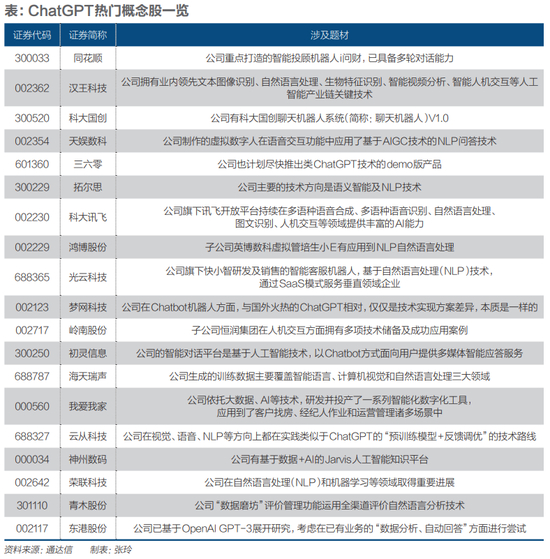 除了上述两只股票外,涨幅比较可观的人工智能兼ChatGPT概念股还有:鸿博股份(002229.SZ)、云从科技(688327.SH)、初灵信息(300250.SZ)、天娱数科(002354.SZ)、三六零(601360.SH)、智能自控(002877.SZ)、浪潮信息(000977.SZ)、科大讯飞(002230.SZ)、宁夏建材(600449.SH)等。