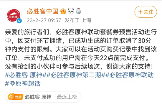 “崩”上热搜!必胜客与《原神》再次联动,支付环节拥堵,原因是......