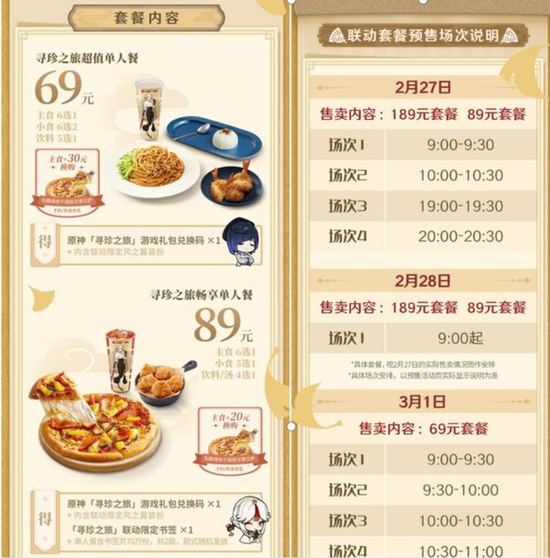 消息显示,2月27日,《原神》联动必胜客活动“必胜邀约寻珍之旅”正式开启,购买联动指定主题套餐,即可获赠联动限定周边及‘原神寻珍之旅礼包’兑换码,礼包内含“星筵之翼”限定风之翼装扮及“百味醇韵”小摆设。