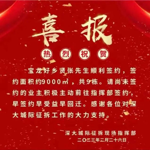 “一夜暴富!深圳一业主签约9栋约9000平方米!来自深大城际征拆现场指挥部的祝贺!”