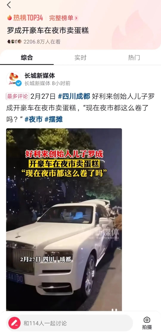 近日,一则“罗成开豪车在夜市卖蛋糕”的词条登上抖音热搜,视频中的主人公罗成开着一辆劳斯莱斯,正在成都的夜市中摆地摊。