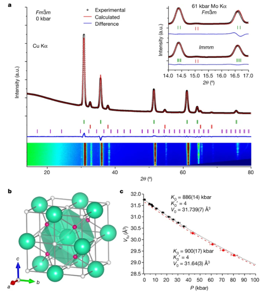 b图则是他们绘制的晶胞图,白色原子是氢,绿色的是镥,粉红色的是氮原子,他们给出的样品化学式是LuH3−δNε,61kbar时空间群是Fm-3m和Immm,但Dias认为超导相空间群是前者。