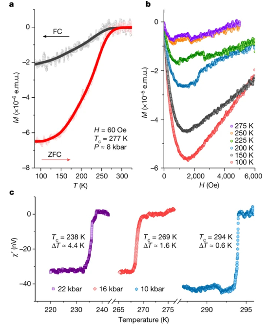 这张图是对磁化率的测量,a图是60Oe(Oe是高斯单位制中表示磁场强弱的单位,可以理解为高斯,即1T=10000Oe)下8kbar(0.8GPa)的磁矩随温度的变化图,可以明显看到其Tc为277K(4℃),b图给出磁矩与外磁场的关系,也符合超导体的特征,c图则是不同压力下的M-T曲线,这里的Tc与电阻上的保持一致,转变温度区间也很小,是非常好的转变。不过在a图中也可以看出来研究团队对原始数据做了一定处理。