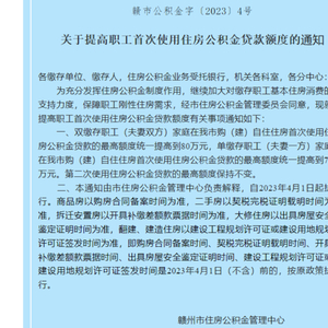 3月22日,据江西省赣州市住房公积金管理中心消息,赣州市发布《关于提高职工首次使用住房公积金贷款额度的通知》及《关于统一全市住房公积金贷款最高额度的通知》,明确赣州市公积金首次贷款最高贷款额度提高,最高可贷80万元,并自4月1日起执行。