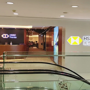 从Chanel搭乘扶手电梯到达汇丰只需10秒,但两家门口的景象却是截然不同,与买包顾客的熙熙攘攘相比,这家十分宽敞阔绰的银行门口只有零星两三位正在ATM取钱。负责开户的卓越理财中心前台,有4位职员并排坐着,大厅并没有人排队,走廊尽头的营业厅里倒是有些许人影。