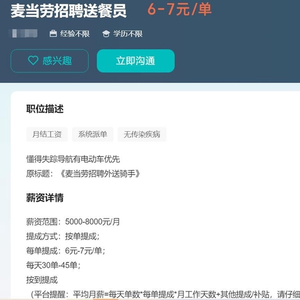 一招聘平台招募麦当劳送餐员的信息内容截图。
