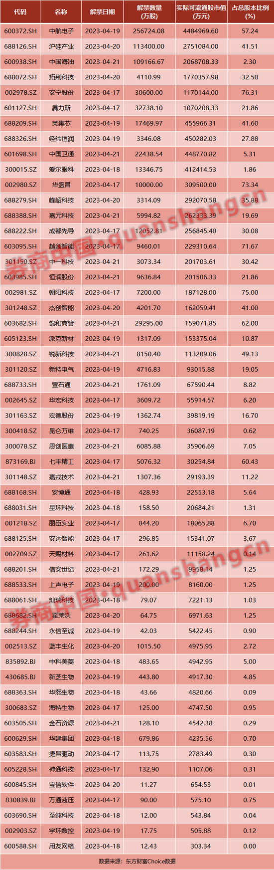 数据显示,本周(4月17日~4月21日)共有54家公司限售股陆续解禁,合计解禁量73.76亿股,按4月14日收盘价计算,解禁市值为1816.4亿元。