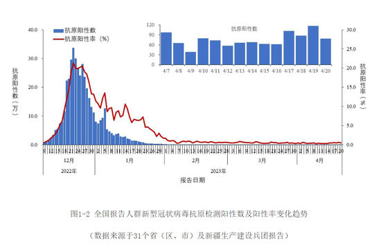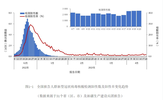 2022年12月9日以来,各省份报告人群新冠病毒核酸检测阳性数及阳性率呈现先增加后降低趋势,阳性人数12月22日达到高峰(694万)后波动下降,2023年4月20日降至2661例。检测阳性率2022年12月25日达高峰(29.2%)后波动下降,2023年4月20日为1.7%