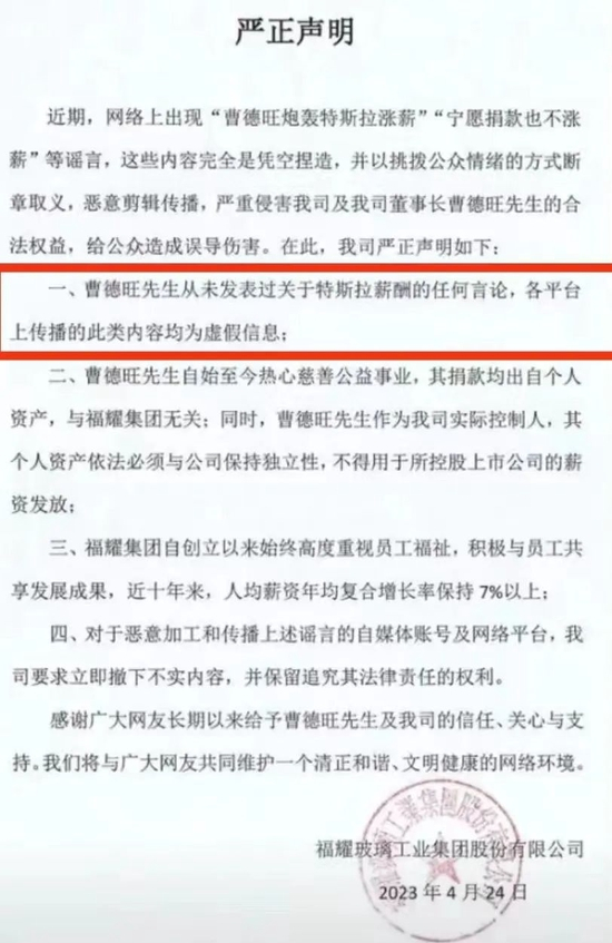 网传曹德旺称特斯拉恶意涨薪,破坏劳动力市场平衡。“宁愿捐出100亿,也不会给员工涨工资,因为高工资会让年轻人失去奋斗的动力”等言论。