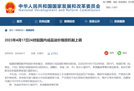 4月17日,国家发改委公告称,根据近期国际市场油价变化情况,按照现行成品油价格形成机制,自4月17日24时起国内汽、柴油价格(标准品,下同)每吨分别提高550元和525元。