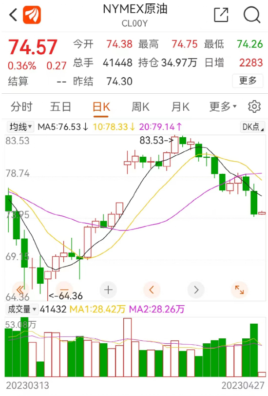 截至当天收盘,纽约商品交易所6月交货的轻质原油期货价格下跌2.77美元,收于每桶74.30美元,跌幅为3.59%;6月交货的伦敦布伦特原油期货价格下跌3.08美元,收于每桶77.69美元,跌幅为3.81%。