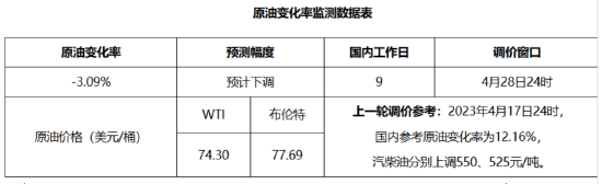 卓创资讯测算,4月27日,国内第9个工作日参考原油变化率为-3.09%。预计汽柴油下调135元/吨,折算下调0.10-0.12元/升。