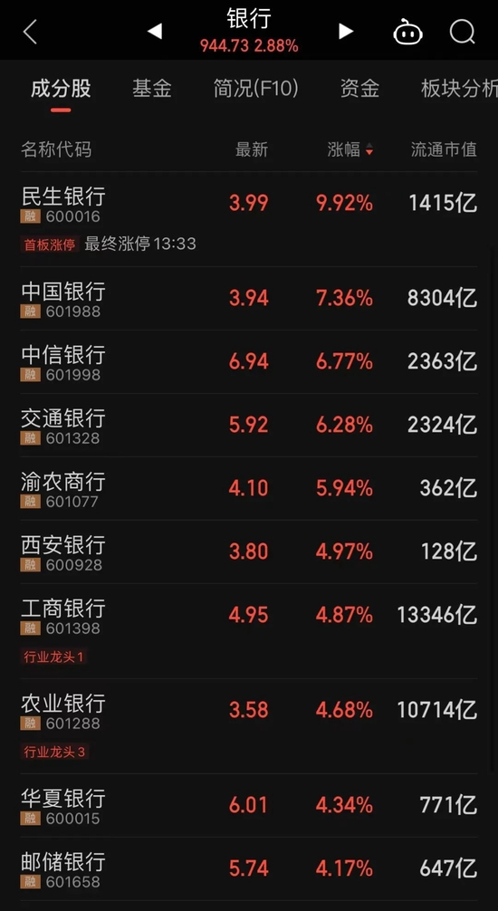 今日大金融板块沸腾,银行股中,千亿市值民生银行午后涨停,为2015年12月以来首次。中国银行、中信银行、交通银行等涨超6%,农业银行、中国银行股价均逼近历史高点。