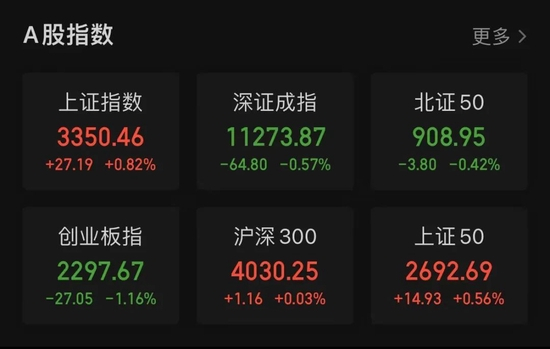 五月首个交易日,A股市场分化,银行、保险等金融权重股全天保持强势,带动沪指上行。多只中字头和国企概念股也大幅上涨。截至收盘,上证指数报3350.46点,上涨0.82%,收获四连阳;深证成指报11273.87点,下跌0.57;创业板指报2297.67点,下跌1.16%。