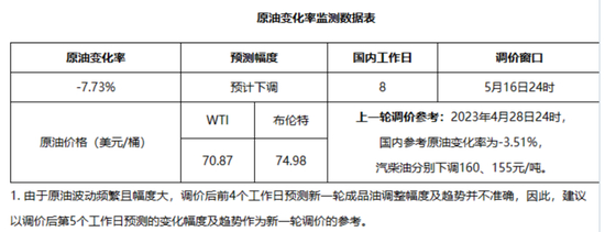 据卓创资讯测算,5月12日,国内第8个工作日参考原油变化率为-7.73%。预计汽柴油下调350元/吨,折算下调0.27-0.30元/升。