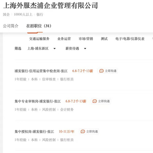 招聘网站显示,外服杰浦系上海外服(集团)有限公司全资子公司。公司成立于2016年,致力于为浦发银行提供岗位外包、业务流程外包(BPO)服务,公司具有唯一性、排他性的特点,整体的运营围绕浦发银行的外包业务开展,以确保浦发银行的风险可控性。目前,在招聘网站上,外服杰浦仍在为浦发银行、浦银理财进行人员招聘。同时,也为其他银行进行招聘。