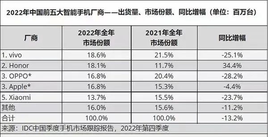 2022年,OPPO成为五大手机厂商(另四家为:苹果、小米、荣耀、vivo)中销量下滑最严重的一家,IDC数据显示,OPPO 2022年出货量跌幅为27%左右。