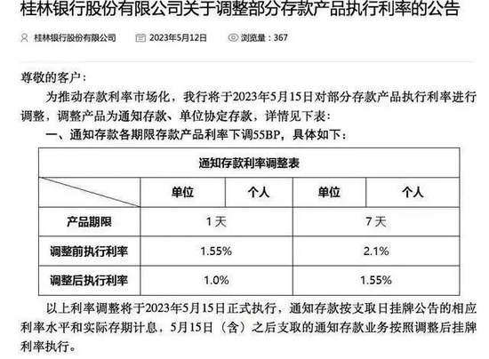 5月12日,位于广西的桂林银行也发布了关于调整部分存款产品执行利率的公告。
