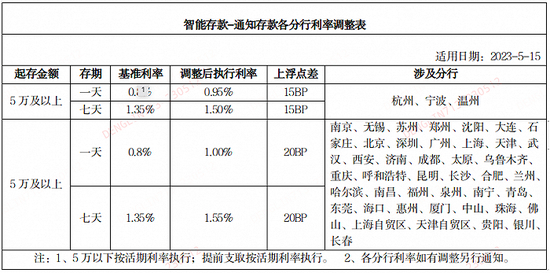 平安银行发布的《关于平安银行智能存款-通知存款产品调整的公告》显示,该行将于5月15日起调整智能存款-通知存款执行利率,其中多数分行1天期、7天期执行利率均较基准利率加点20bp,即调整后1天期和7天期的执行利率分别为1%和1.55%;杭州、宁波、温州等3家分行执行利率均较基准利率加点15bp,即调整后1天期和7天期的执行利率分别为0.95%、1.50%(3家分行)。