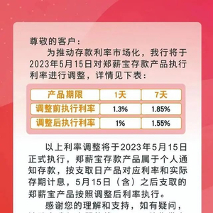 此外,郑州银行则对郑薪宝存款产品执行利率下调30个BP。公告显示,此次调整前郑薪宝的1天期和7天期的执行利率分别为1.3%和1.85%;调整后的执行利率分别为1%和1.55%。以上利率调整将于5月15日正式执行,郑薪宝存款产品属于个人通知存款,按支取日产品对应利率和实际存期计息,5月15日(含)之后支取的郑薪宝产品按照调整后利率执行。