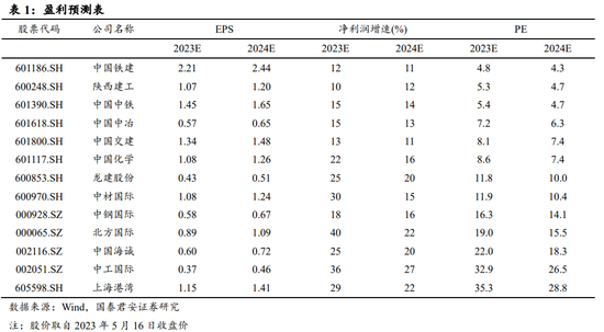 6、中亚峰会召开受益标的新疆交建/北新路桥,推荐陕西建工/中国中铁/中国铁建/中材国际。(1)国资委将新疆交建34%股份划转到新疆交投,成其上市平台,2022年净利增41%ROE13%增3个百分点。(2)北新路桥加速从单一业务向多元业务转变,从单一业务区域向全国化、国际化的拓展,具备了丰富的施工经验和较强的市场竞争力,并已完成投资、施工、运营等产业链上下游布局。(3)陕西建工PE5.3倍是估值最低一带一路地方龙头,股权激励23-25年ROE不低于15.4/14.9/14.8%,利润总额较2021年复合增速不低于10%。(4)中国中铁2023PE5.4倍(最高14倍/2015年最高40倍)PB0.73倍,2014年股价最高涨近十倍,估值底部区域未来弹性空间大;2022年ROE12.13%(+0.50pct),扣非ROE10.95%(+0.03pct),高于股权激励要求的扣非ROE10.5%。(5)中国铁建PB0.60倍,再融资需PB1.25倍,2014年一带一路PE最高23倍目前4.8倍,参与中吉乌铁路规划研究。(6)中材国际2023PE12倍一带一路最低,商业模式由工程升级产品运维,运维与装备毛利超过工程。