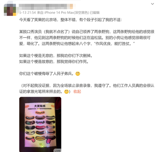然而演出后,却有观众在社交媒体上直言:“有个段子引起了我的不适”“如果这个梗是无意的,那我劝你们下次删掉。如果这个梗是故意的,那我觉得你们作死”“你们这个破梗侮辱了人民子弟兵”。