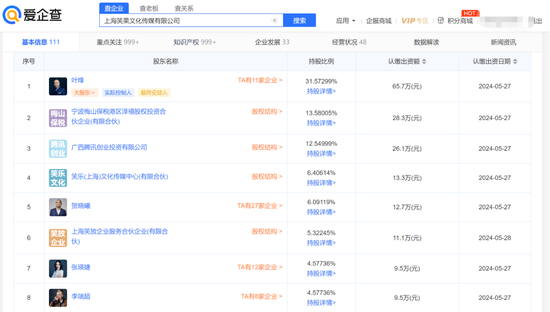 爱企查显示,当前笑果文化法定代表人及实控人均为叶烽,为资深节目制作人,曾任湖南卫视《明星学院》负责人、东方卫视《加油!好男儿》制作人、东方卫视《今晚80后脱口秀》总导演等,后选择创立了笑果文化,目前持股31.57%。而观众所熟悉的另一笑果文化代表演员李诞(本名李瑞超),则以4.58%的持股并列第7大股东席位。