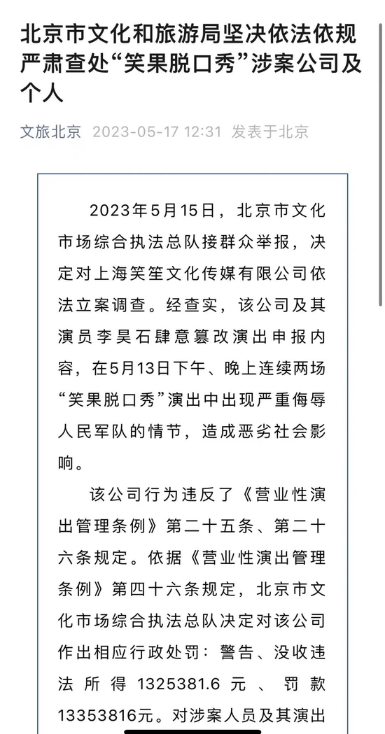 5月17日,北京市文化市场综合执法总队经查实,发现上海笑笙文化传媒有限公司及其演员李昊石肆意篡改演出申报内容,在5月13日下午、晚上连续两场“笑果脱口秀”演出中出现严重侮辱人民军队的情节,造成恶劣社会影响。依据相关规定,执法总队决定没收笑笙文化违法所得132.54万元、罚款1335.38万元;北京市文旅局决定,将无限期暂停涉事公司在京所有演出活动。而这家公司,5月才刚刚获得在北京的营业性演出许可。