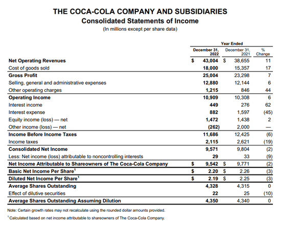 除了销量增速略有放缓,可口可乐的另一隐忧是,公司增收不增利:2022年在营收增长11%的情况下,净利润同比下滑了2.3个百分点。