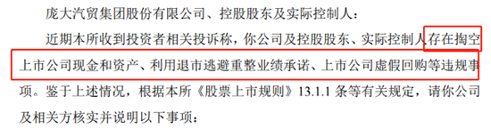 就在5月19日,上交所向公司下发关于收到信访投诉有关事项的监管工作函。有投资者投诉称,公司及控股股东、实际控制人存在掏空上市公司现金和资产、利用退市逃避重整业绩承诺、上市公司虚假回购等违规事项。上交所对此抛出了四方面6个问题,要求公司说明。