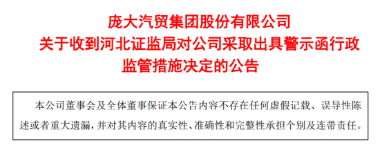 庞大汽车还于5月20日公告,公司及相关责任人在2023年5月19日收到中国证监会河北监管局行政监管措施决定书。