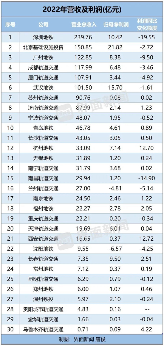 2022年疫情反复,公众出行受到影响,不少地铁的营收出现下滑,与此同时净利润也下滑。