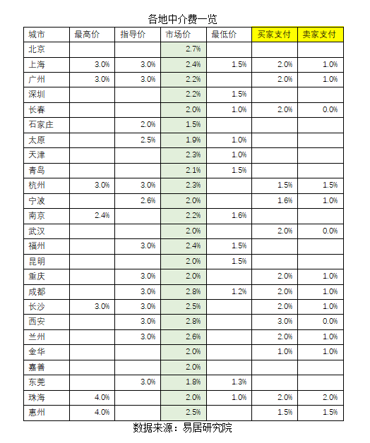 具体城市方面,成都、西安和北京的中介费略高,分别为2.8%、2.8%和2.7%。