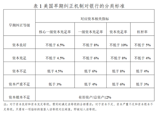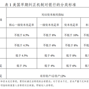 监管机构和FDIC共同对银行实施早期纠正。FDIC按照银行的资本充足情况和杠杆水平,将其划分为资本良好、资本充足、资本不足、资本严重不足和资本根本不足等5个等级(如下表所示)。当银行处于资本不足和资本严重不足的状态时,主要由其监管机构采取早期纠正措施;当银行资本根本不足时,则主要由FDIC对其采取早期纠正措施。