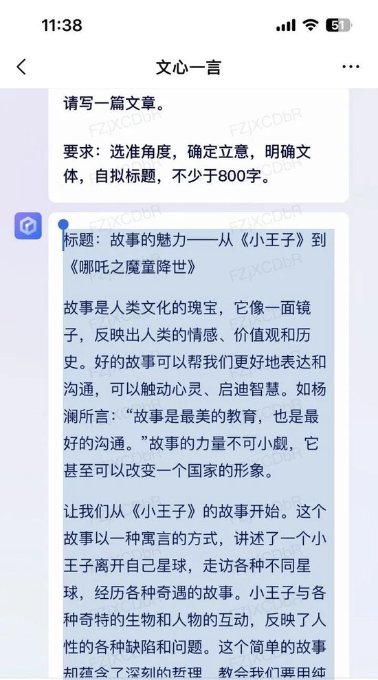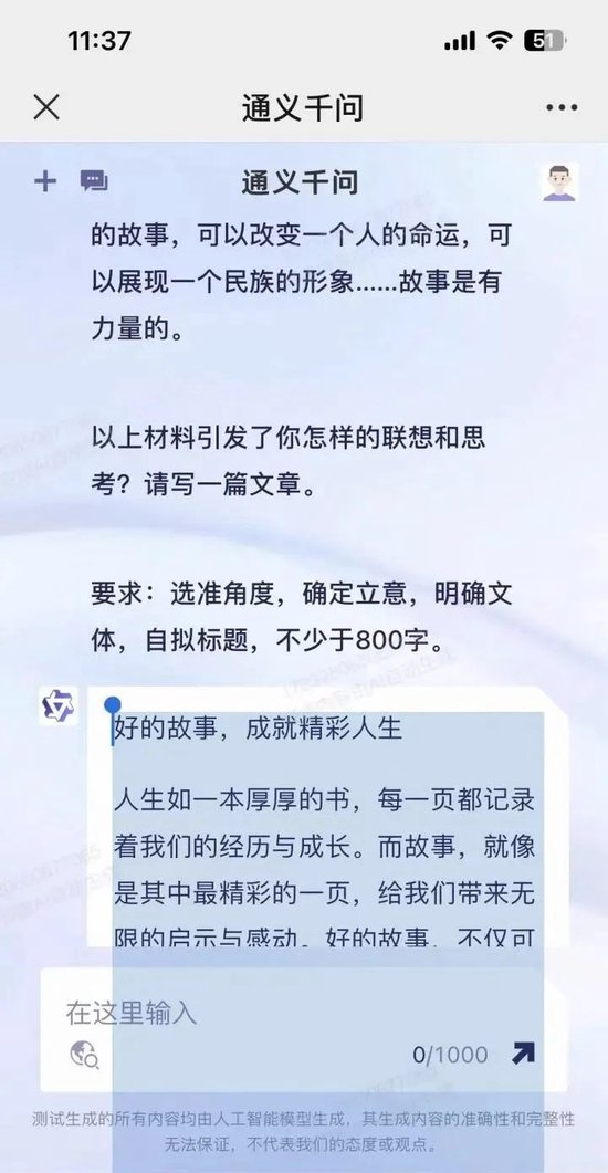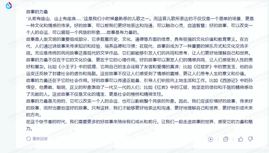 复旦大学中文系教授王宏图表示,几篇AI以“好的故事”为题目写的作文,都很流畅,侧重点各不同。但它们读上去像是教科书,这里面很难找到缺陷错误,但也找不到任何个性化的表达与特征。它们有点像一个机器人站在你面前,每个动作都非常准确,但脸部缺乏表情,缺乏温度,最主要的是缺乏情感,只是在执行某个终端发出的命令。